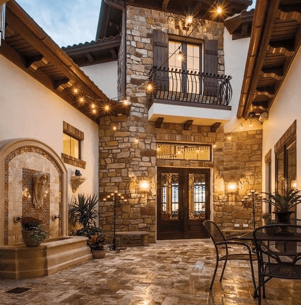 This Design dictates the use of rich Fabrics with deep tones of Gold, Rust, Terra Cotta and Green. Exposed Beams, in a deep color, Arches and Balconies will reflect the Architecture of the Mediterranean. Rich Designs in Area rugs and Custom Window Treatments in Deep Tones are commonly used.