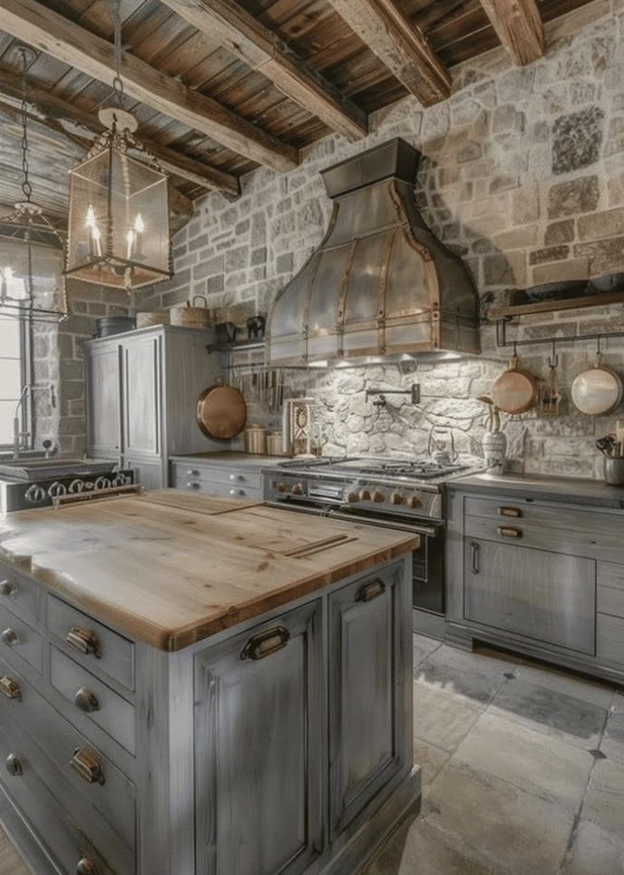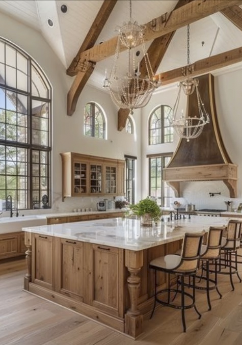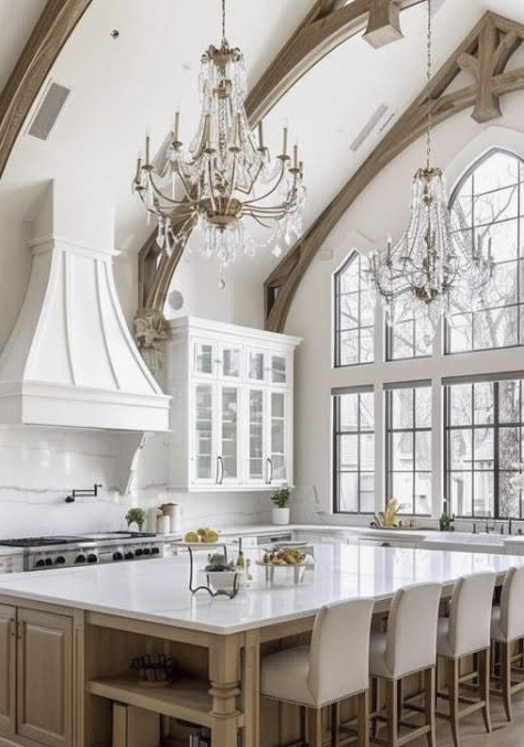 This is a Design style that captures the essence of a Romantic Countryside Retreat. To achieve an authentic French Country Design Style, natural materials such as Stone and Wood are commonly used with exposed beams, distressed finishes and raw textures that add character to this space, showcasing the beauty of imperfections. Additionally, soft muted colors in Fabrics for Window Treatments, Accent Chairs and Pillows with Patterns of Floral and Plaids are used, sometimes with a touch of Lace. Crystal or aged Chandeliers are used for this Design.
