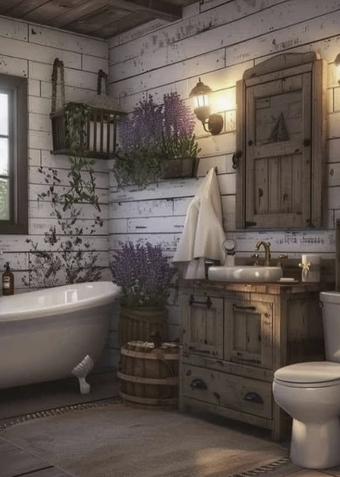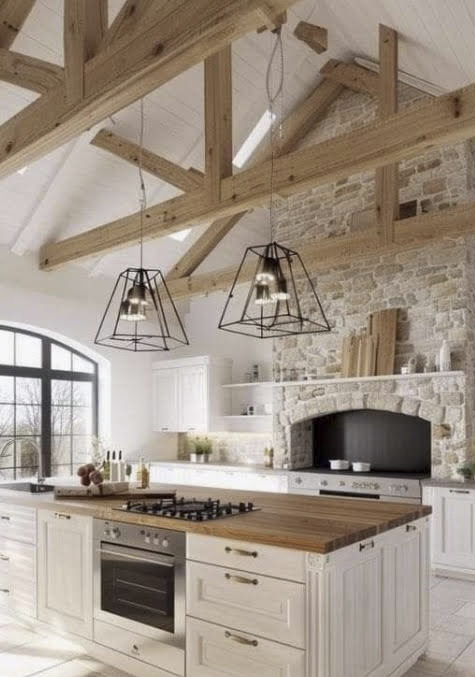 A true Farmhouse Décor creates a cozy atmosphere with combinations of Stone, Brick, and Hardwood Floors. Rustic Barn Doors and natural exposed Beams, reflect this style. Furniture is comfortable with Print Accent Pillows. Vintage and antique pieces pair very well with this look.