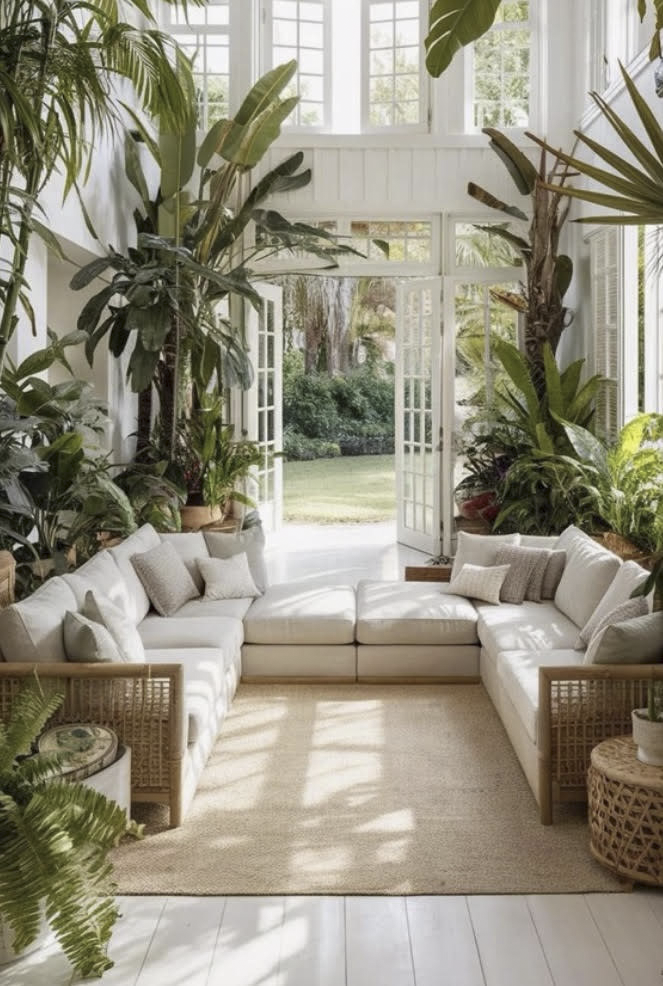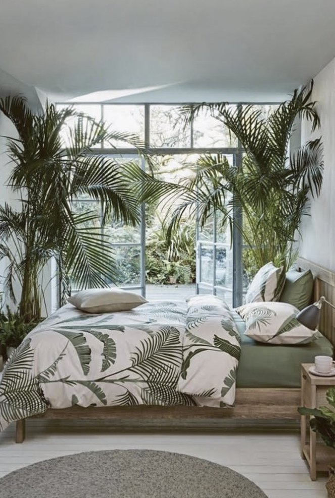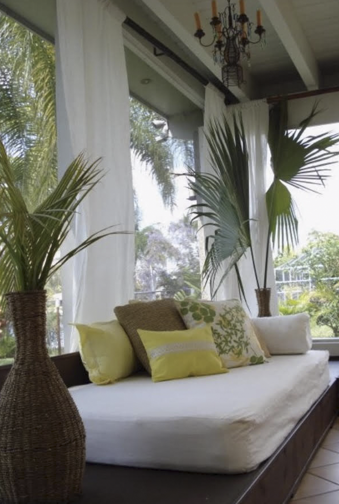 This Design is a minimalistic look w/ natural, neutral Fabric with Dark or Natural wood Floors and Furniture. The main focus is on Large Tropical Plants and large Tropical Prints in Fabric for Accent Pillows, Drapery Panels and Bedcoverings.